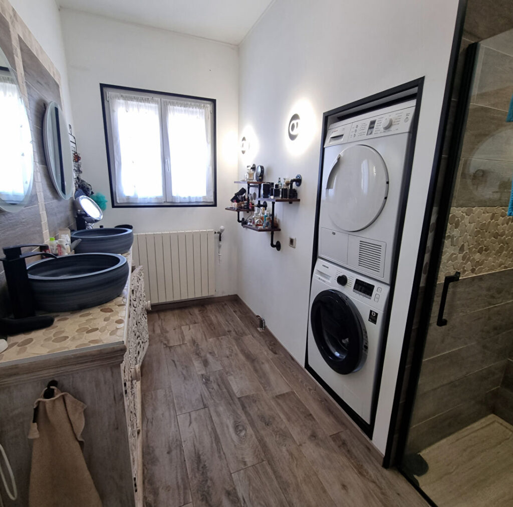 La maison en excellent état comprend une partie principale sur deux niveaux, est composée d’un séjour double, une cuisine, aménagée, cinq chambres lumineuses et spacieuses, un bureau deux salles d’eau avec douches à l’italienne, un dressing et deux WC. Le chauffage est géré par une pompe à chaleur moderne et performante.